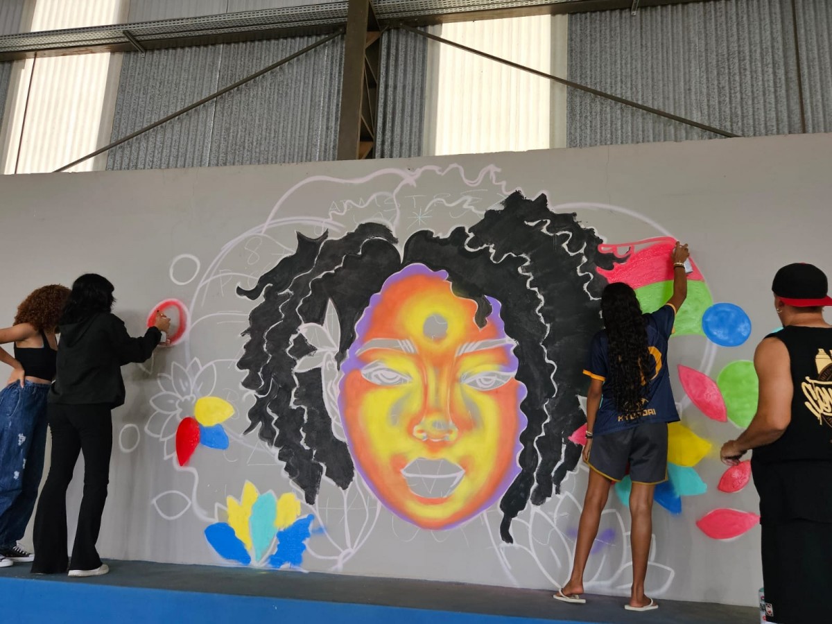 Na prática, todos puderam colaborar na pintura de um rosto feminino, simbolizando força e diversidade, na parede da arquibancada da quadra. Vitória, de 6 anos, demonstrou empolgação ao grafitar uma pétala azul. “Eu gostei muito! É só usar o dedão para apertar o spray se for difícil”, compartilhou. Maria Eduarda, de 15 anos, também elogiou: “Foi uma experiência nova para mim. Eu gostei”.