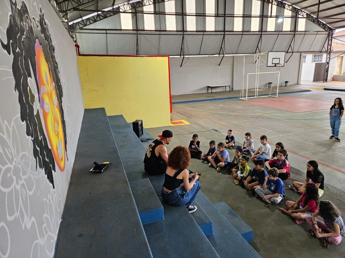 O evento teve início com uma roda de conversa sobre a cultura hip hop e os fundamentos do graffiti. “Vocês conhecem o graffiti?”, perguntou Wesley. As respostas espontâneas – “o da lapiseira” e “o do lápis” – abriram caminho para uma explicação detalhada sobre a origem do termo, os materiais e técnicas, como o uso de sprays e bicos específicos.